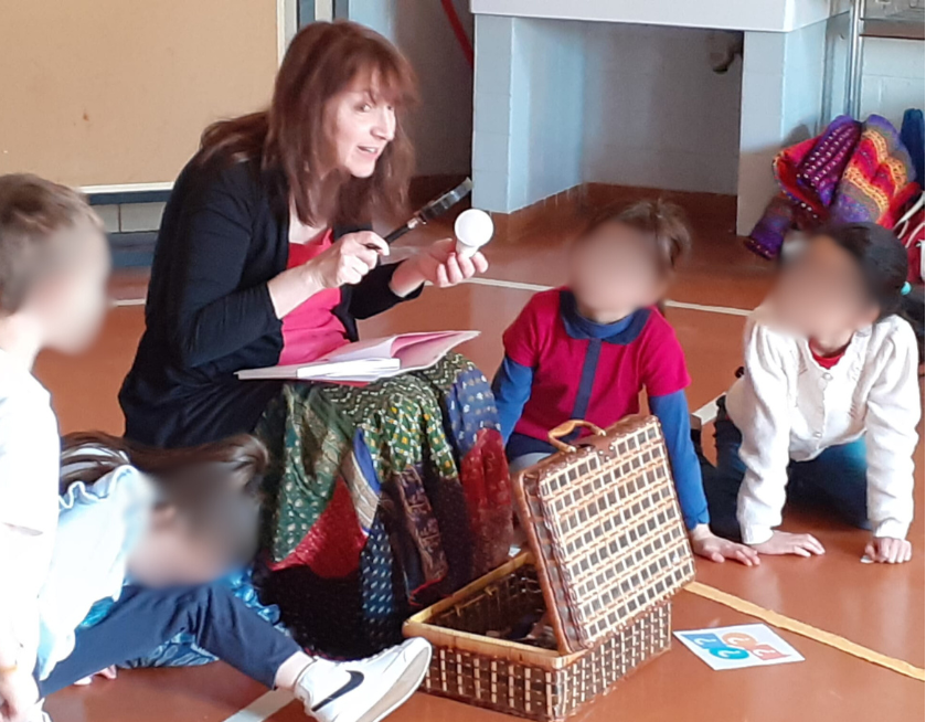 Valérie est intervenue 2 fois dans ma classe de moyenne section. Les contes sont vivants car surgissent de ses sacs des marottes et des instruments de musique pour capter l’attention des enfants.